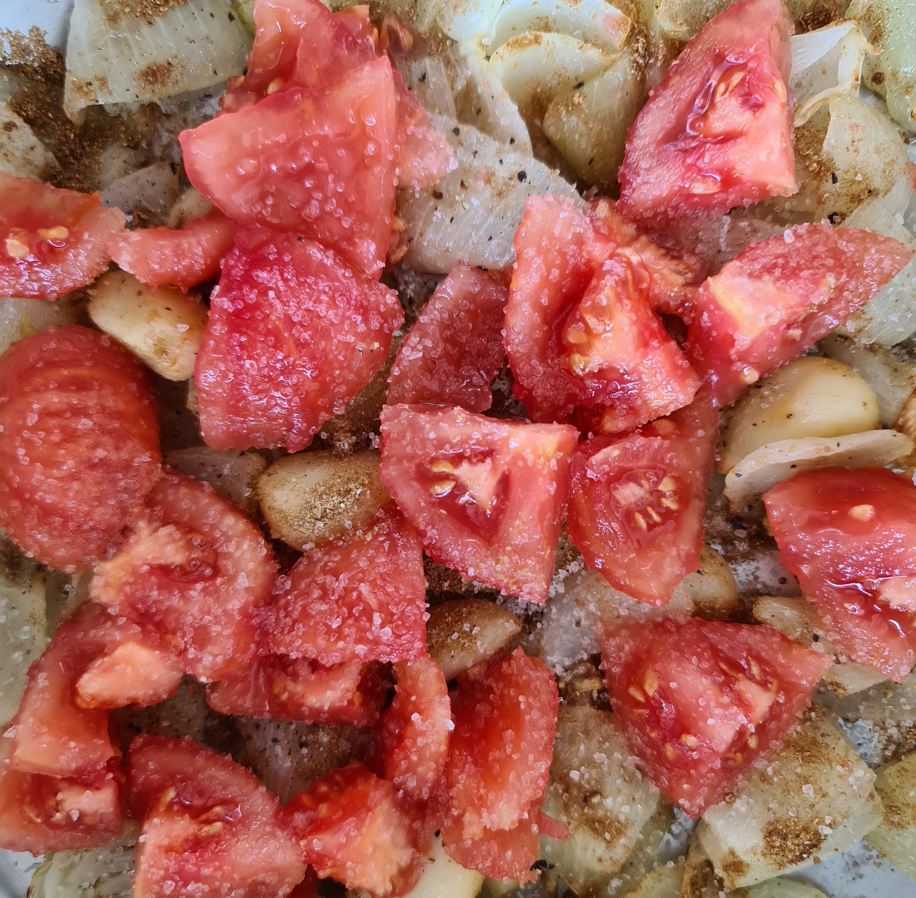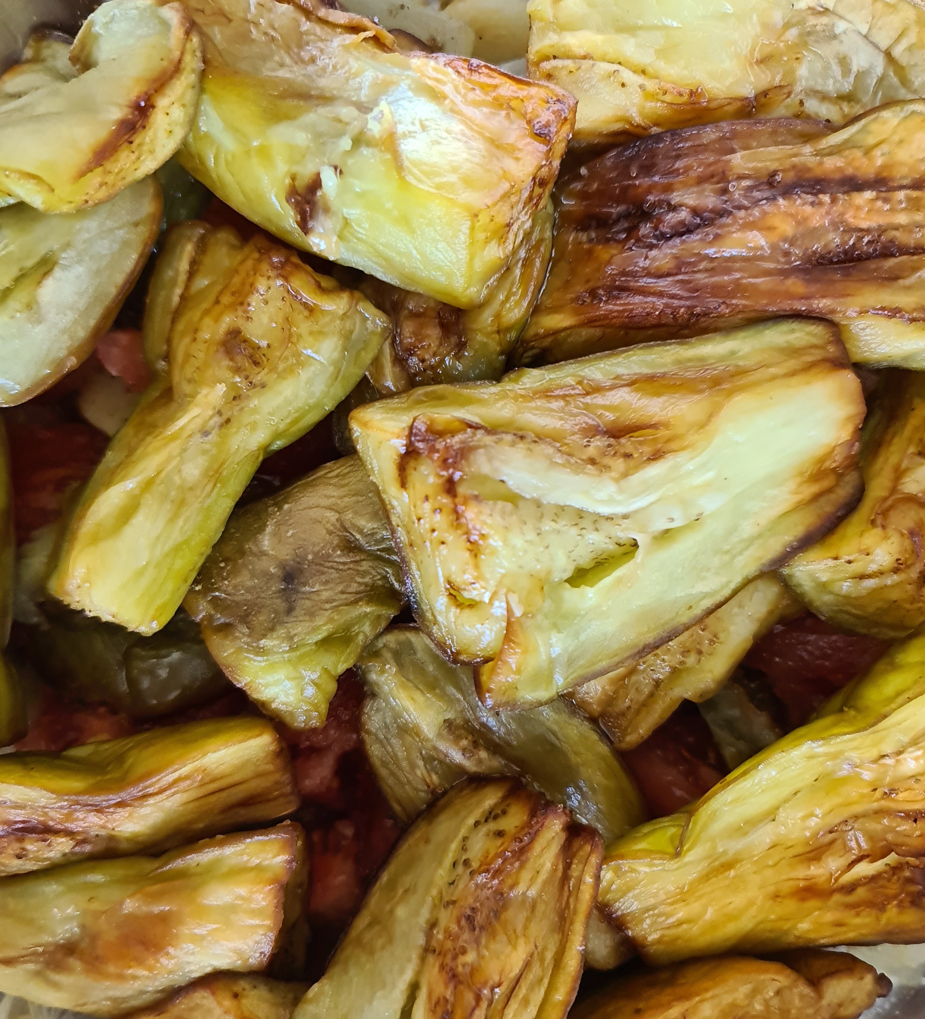 - In another pan over slow heat, add the fried onion, garlic, eggplants, tomatoes, coriander and lemon juice.